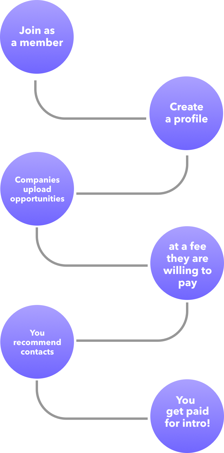 Companies use the platform 100% for free and THEY choose exactly what they would be willing to pay for YOUR recommendations. As a member you get immediate access to the Expert Referrer Panel.